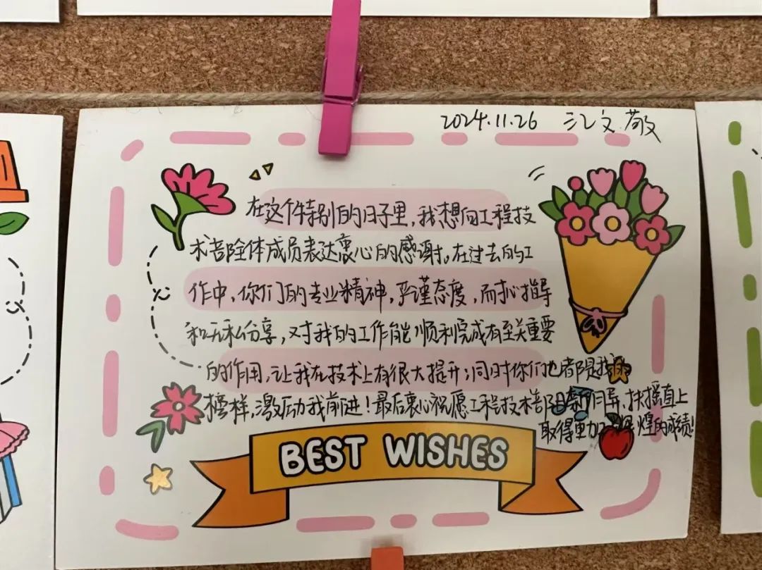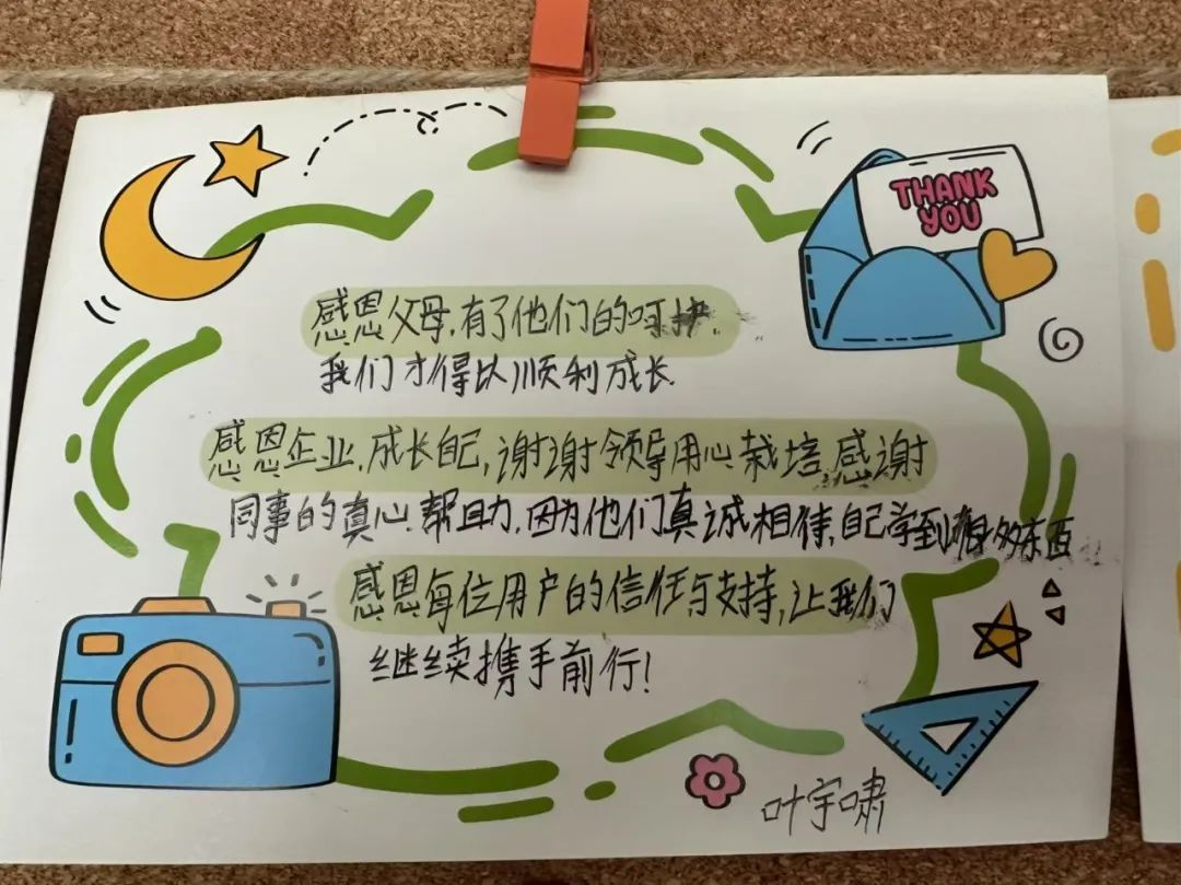 让我们用文字传递温暖,让每一份感激都能找到归宿。用卡片写下感激之情,无论是对某个人的感谢,还是对团队或者公司的赞美,公司都会做好感恩墙记录。